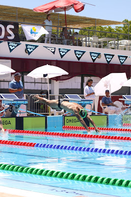 Quanto à prova, a natação saiu-me invulgarmente bem. O percurso, rectangular, bem marcado, desenhado numa baía abrigada, com água a 22C. Fiz 33' saindo em 8º do meu Agegroup.